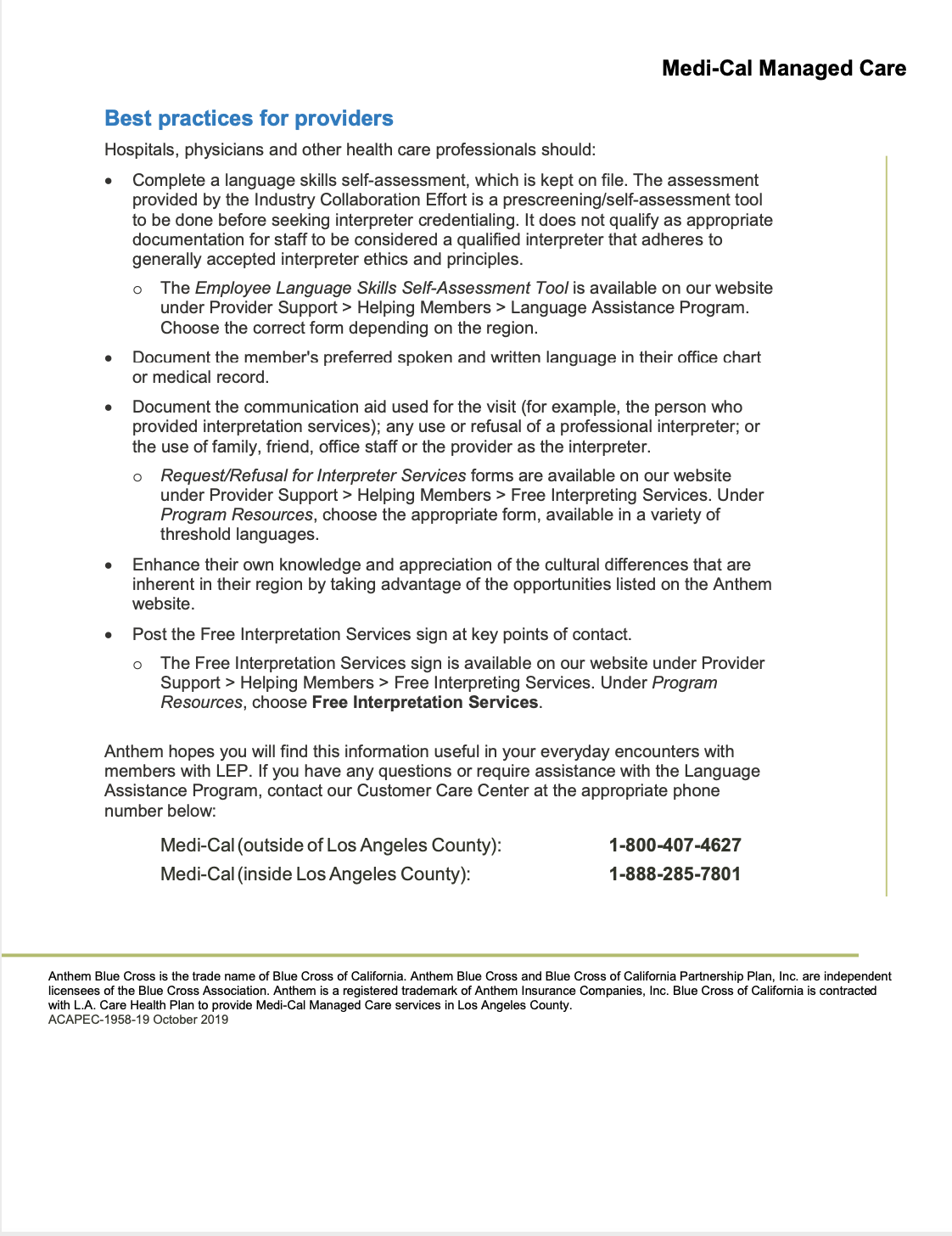 SEE BELOW FOR INFORMATION ON BLUE CROSS’ LANGUAGE ASSISTANCE PROGRAM